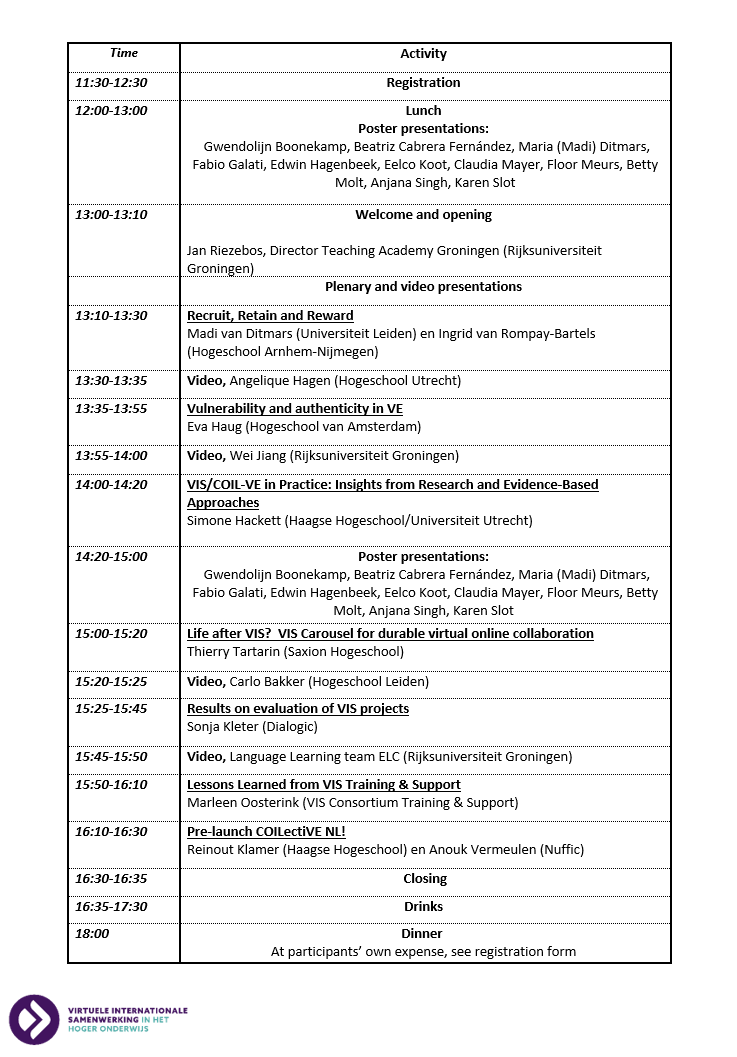 VIS Live! has developed into the meeting and knowledge exchange place for everyone in the Netherlands who is involved in Virtual International Collaboration activities. During this closing event, we want to celebrate the successes of recent years and focus on the structural embedding and continuation of virtual international collaboration in institutions.